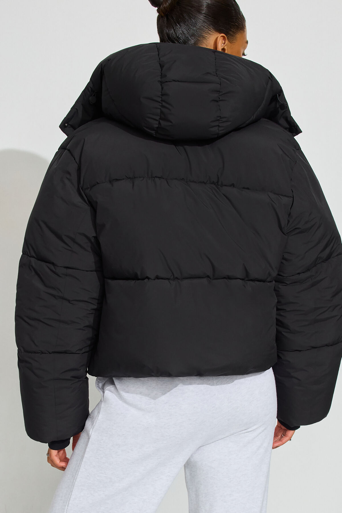 Chill Puffer Jacket Black women – Note: This style comes in an oversized fit. We recommend wearing a size down for a tighter fit. It’s getting hot in here. Features Detachable hood with bungee-style drawstring Zip closure Welt pockets with snap closure Adjustable hem Thumbhole at inset cuffs Zip pocket at lined interior Size & Fit Fit: Oversized Length: Regular The model is wearing size S/M Materials & Care Water-repellent fabric Content: 100% recycled polyester Care: Dry clean only Imported