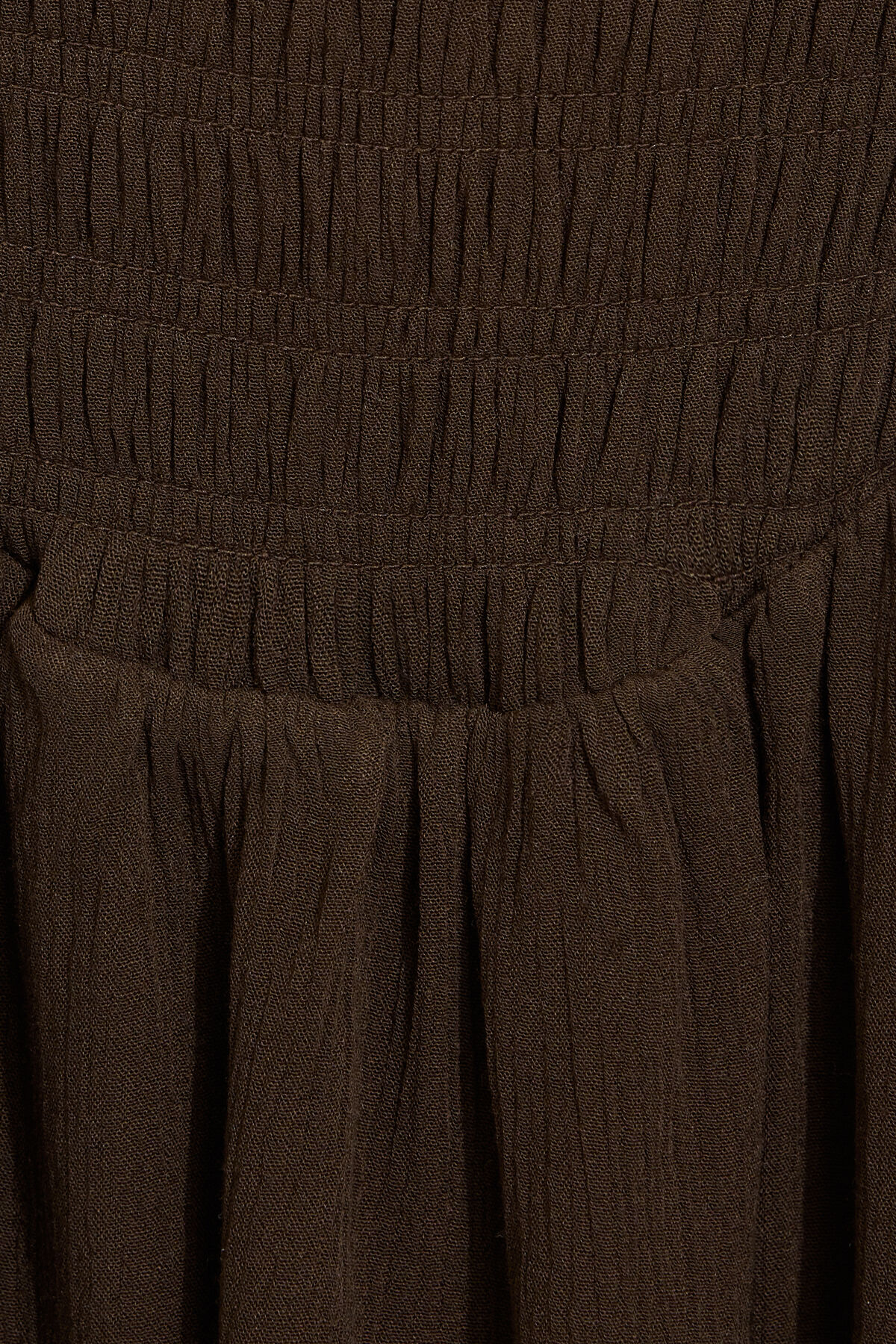 Kenzie Smocked Tiered Romper Brown women – Like a dress , but even better <3 Features Adjustable shoulder straps Ruffled trim detail at neckline Self-tie closure at open back Tiered mini skirt Shorts-style lining Size & Fit Fit: Fit and flare Length: Mini Model is wearing size S Materials & Care Content: 100% rayon Care: Machine wash, cold Imported