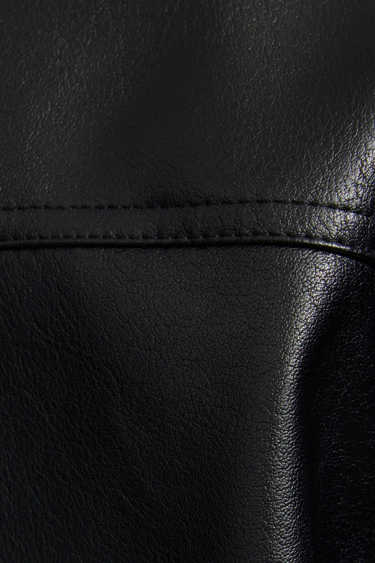 Oversized Faux Leather Stand Collar Bomber Black women – This grained faux leather bomber is giving vintage in all the right ways. Features Stand collar Front zip closure with snap button placket Welt pockets and mock flap pockets at front Adjustable snap button cuffs Elasticized hem Lined Size & Fit Fit: Oversized Length: Regular Model is wearing size S Materials & Care Content: 100% polyurethane Care: Dry clean Imported