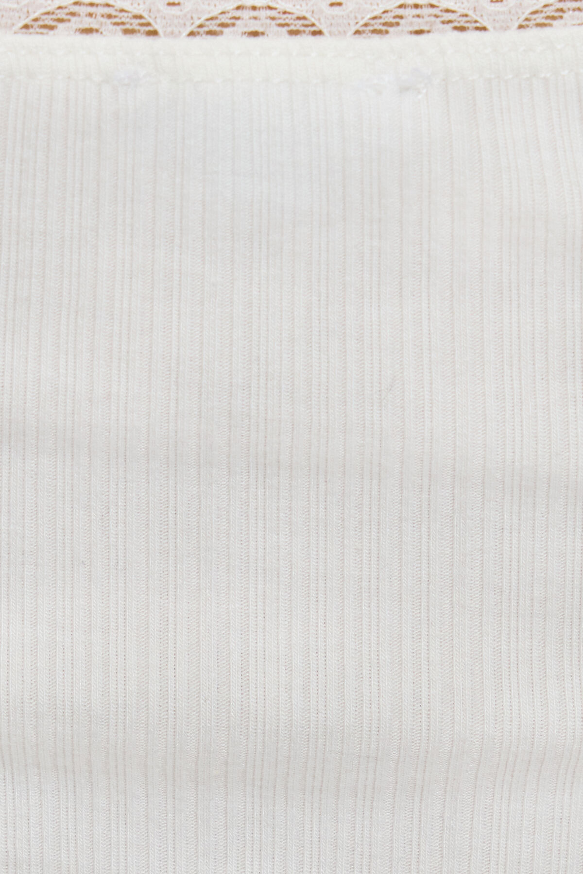 Ribbed Tank Top White women – Muah <3 Features Fixed shoulder straps Ribbon appliqu é at square neckline Lace trim detail throughout Lettuce-edge hem Sheer Size & Fit Fit: Fitted, stretchy Length: Cropped Model is wearing size S Materials & Care Content: 48% cotton, 4% modal, 5% spandex Care: Machine wash, cold Imported