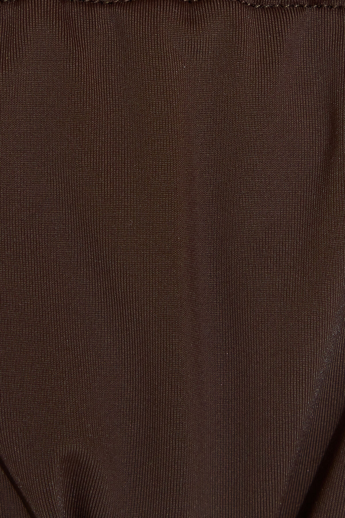 Ruched Tiny Bikini Bottom Brown women – Bikini season has never been more back! Features Ruched detailing Doubled lined Stretchy Size & Fit Coverage: Cheeky Model is wearing size S Materials & Care Content: 85% recycled nylon, 15% spandex Care: Machine wash, cold Imported