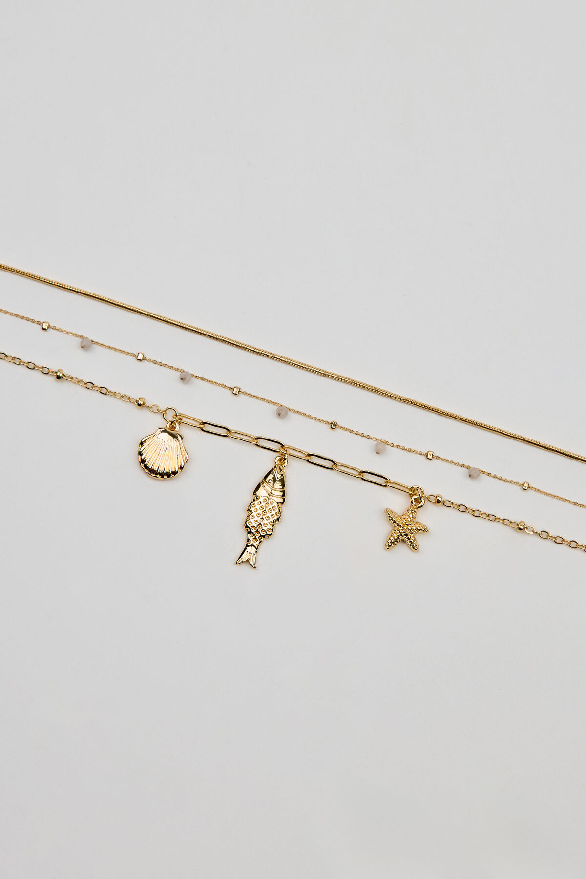 Set of 3 It’s A Catch Necklaces White women – Need to show these off in a bikini . Features Adjustable lobster clasp closure Seashell, fish, and star charms at length Crystal-cut detailing throughout Metal costume jewelry All jewelry is lead, nickel, and cadmium free Imported