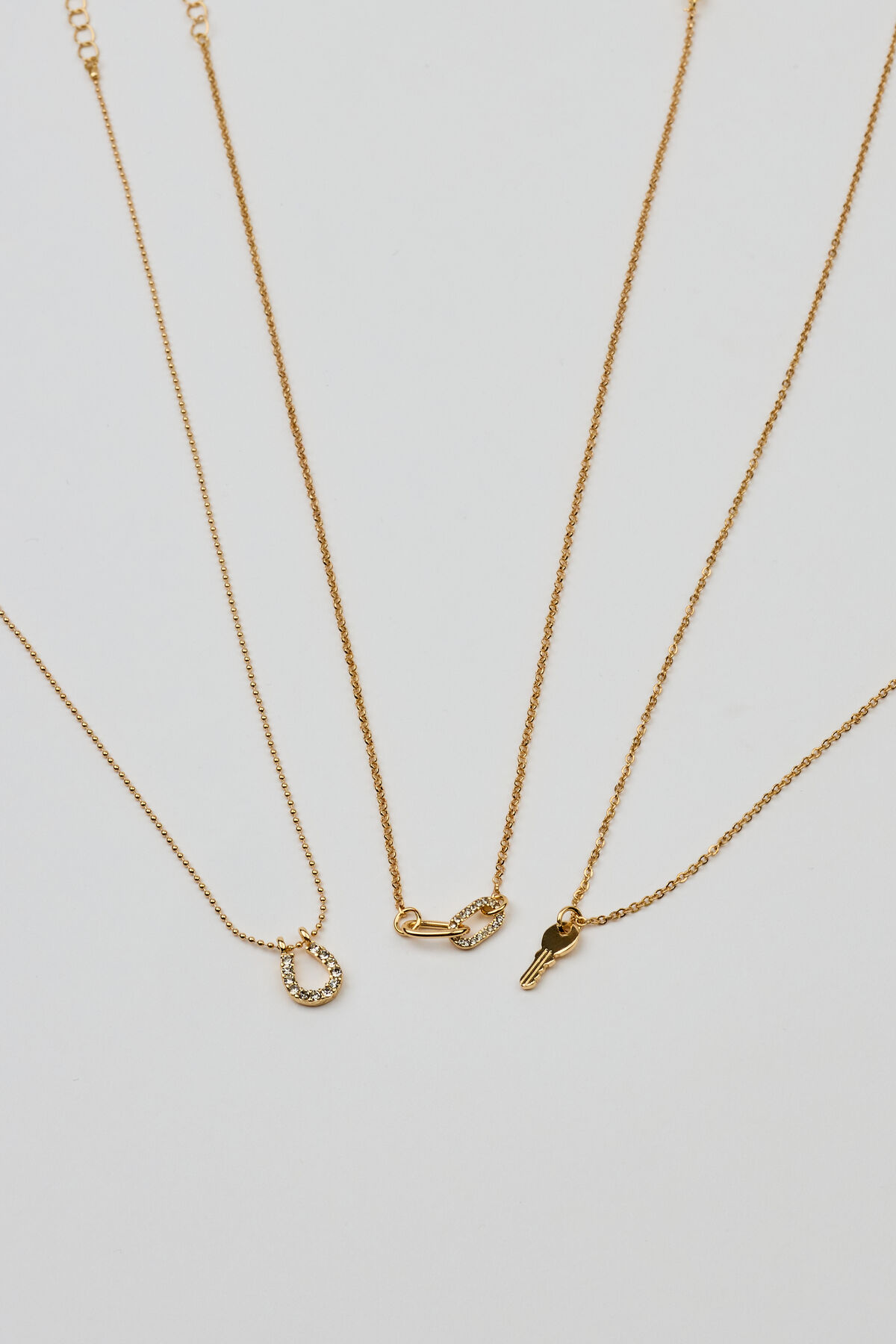 Set of 3 Key, Shoehorn & Link Necklaces White women – These cute charms are aligning with my vision board for this year… there are no coincidences. Features Chain link and bead chain necklaces Adjustable lobster clasp fastening Horseshoe, key, and link charms at drop Metal costume jewelry All jewelry is lead, nickel, and cadmium free Imported