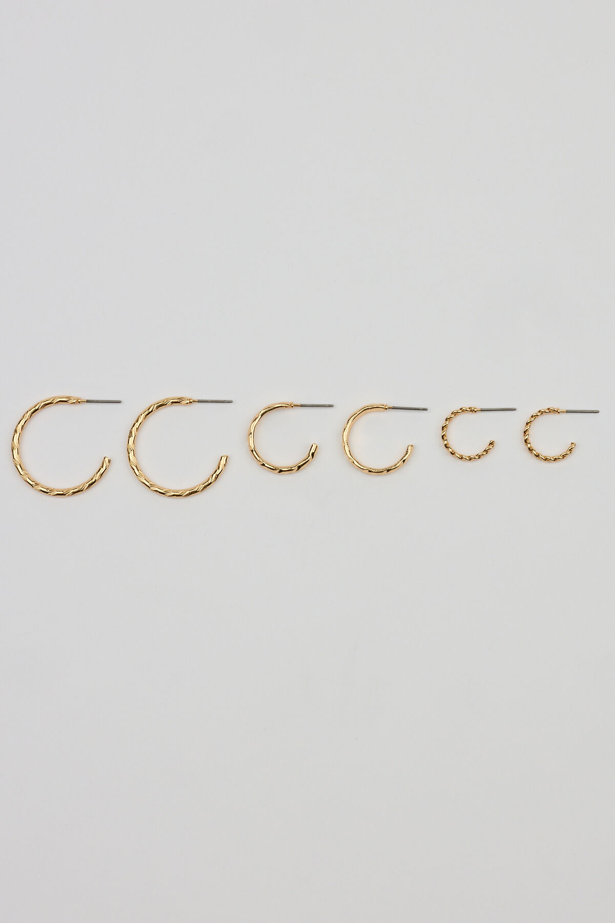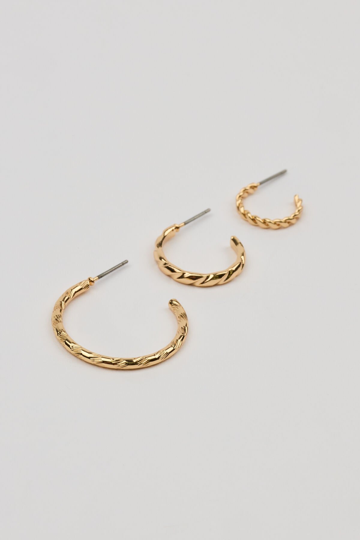 Set of 3 Textured Open Hoop Earrings YELLOW women – Making these my everyday pair. Features Set of 3 pairs Twisted hoop earrings Open back Bullet backing Metal costume jewelry All jewelry is lead, nickel, and cadmium free Imported