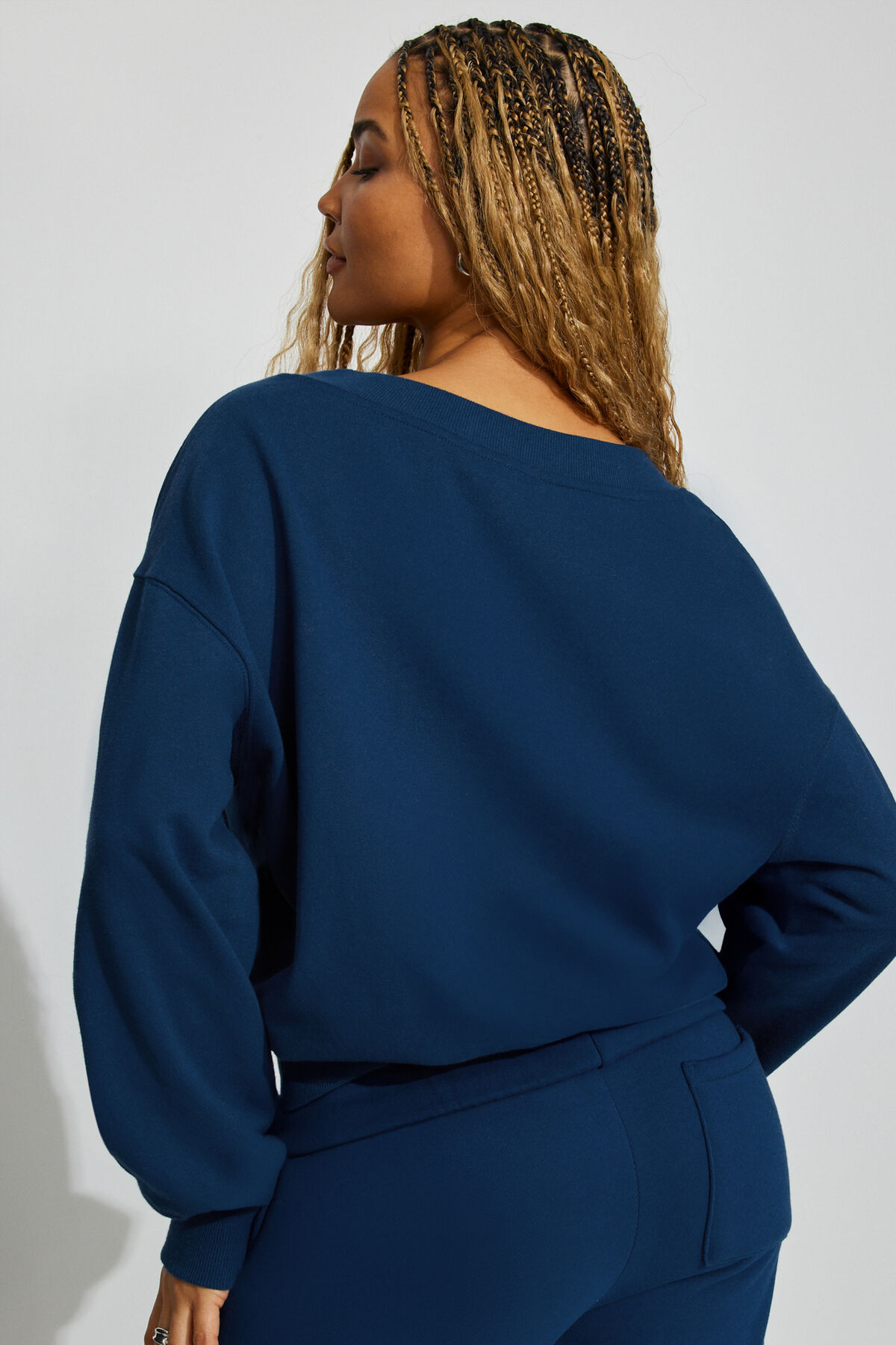 SoftTerry Oversized V-Neck Sweatshirt Navy women – This vibe! Pair with jeans or sweats <3 Features Rib knit V-neck, hem, and cuffs The softest Terry interior Size & Fit Relaxed fit Model is wearing size S Materials & Care 75% cotton, 25% recycled polyester Machine wash, cold Imported