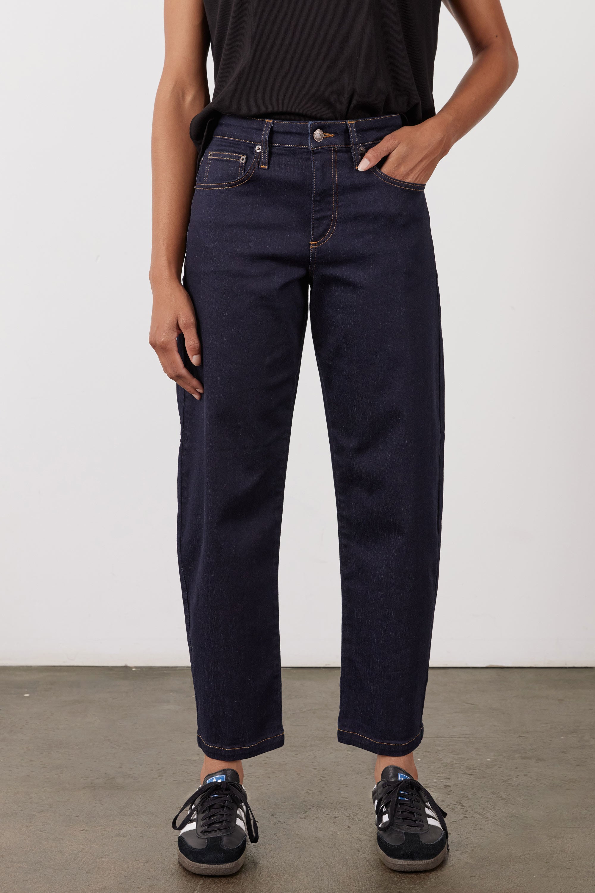 Our classic barrel leg denim pants in a rich dark wash. A tapered leg and a wider leg makes for a flattering fit.