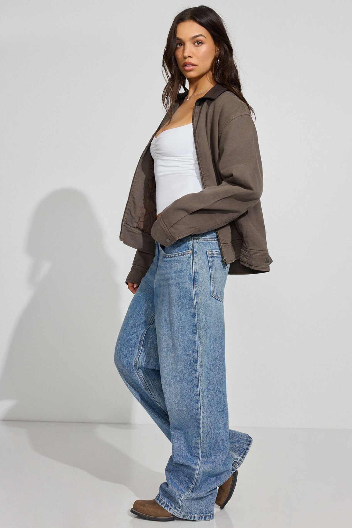 Twill Worker Jacket Brown women – Stepping out in baggy jeans and leaning all the way into the workwear vibe. Features Grained faux-leather spread collar Front zip closure Welt pockets with snap closure Adjustable snap cuffs Quilted lining Size & Fit Fit: Oversized Length: Regular Model is wearing size S Materials & Care Content: 85% cotton, 15% recycled cotton Care: Machine wash, cold Imported